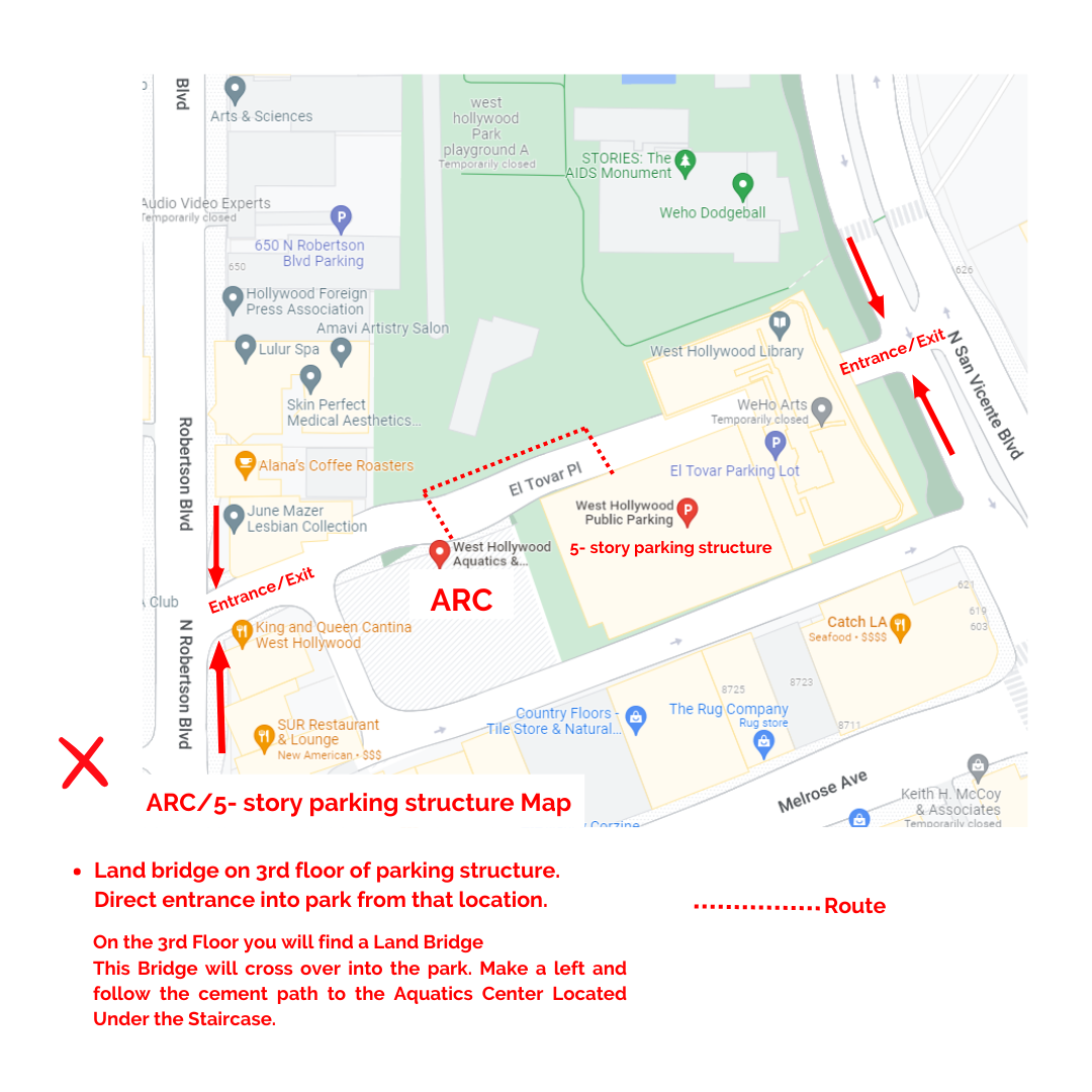 • ARC stands for Aquatics and Recreation Center, and it is a City Building located right next to West Hollywood Park. It is open to the public and features common areas, a full-sized gymnasium, a daycare facility, five rooms available for reservation, two full sized rooftop pools, and rooftop Tennis/Pickleball courts