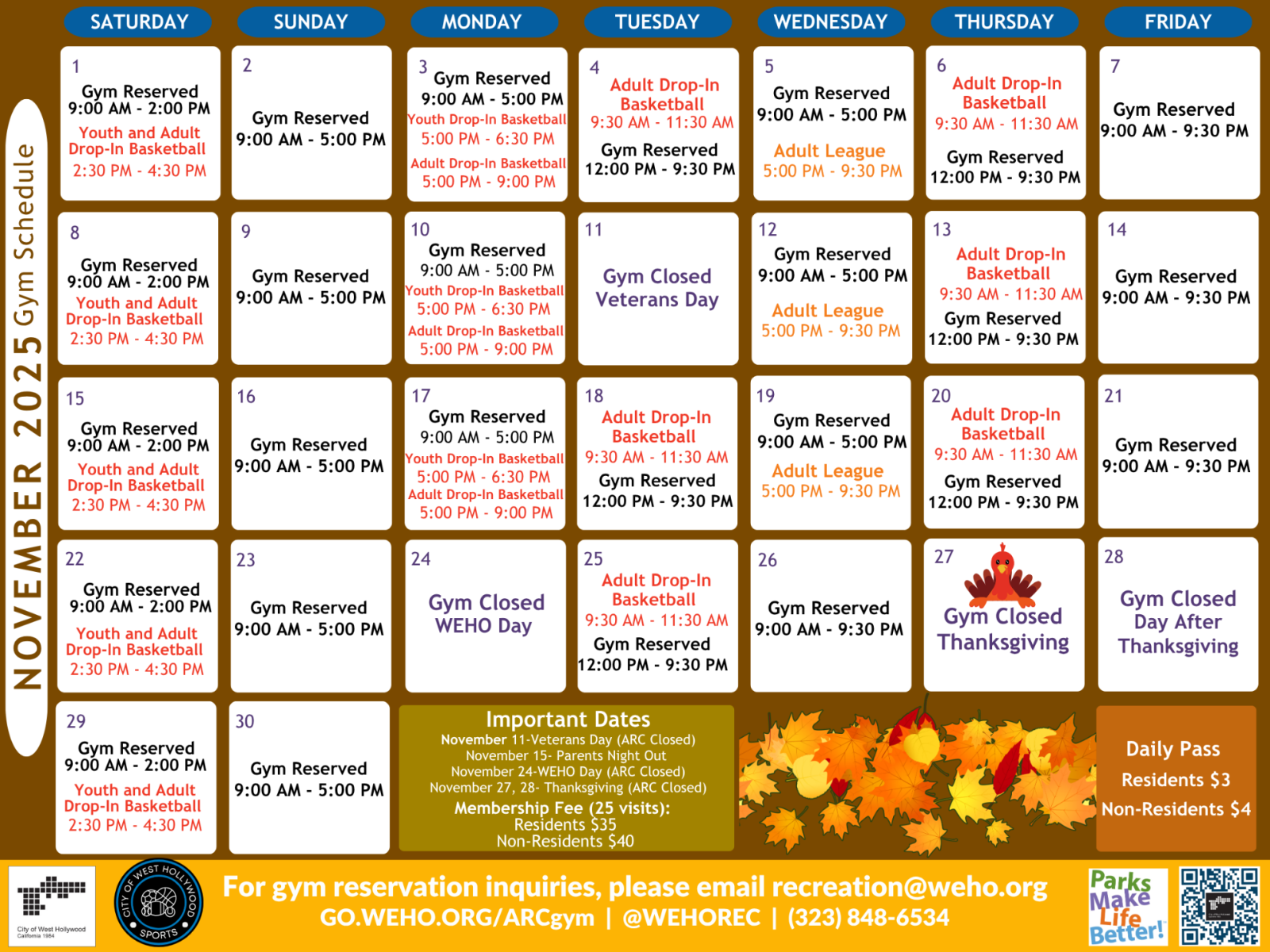 • A Monthly Calendar for Gymnasium Programming, including Drop-in Hours, can be found Online at weho.org/recreation